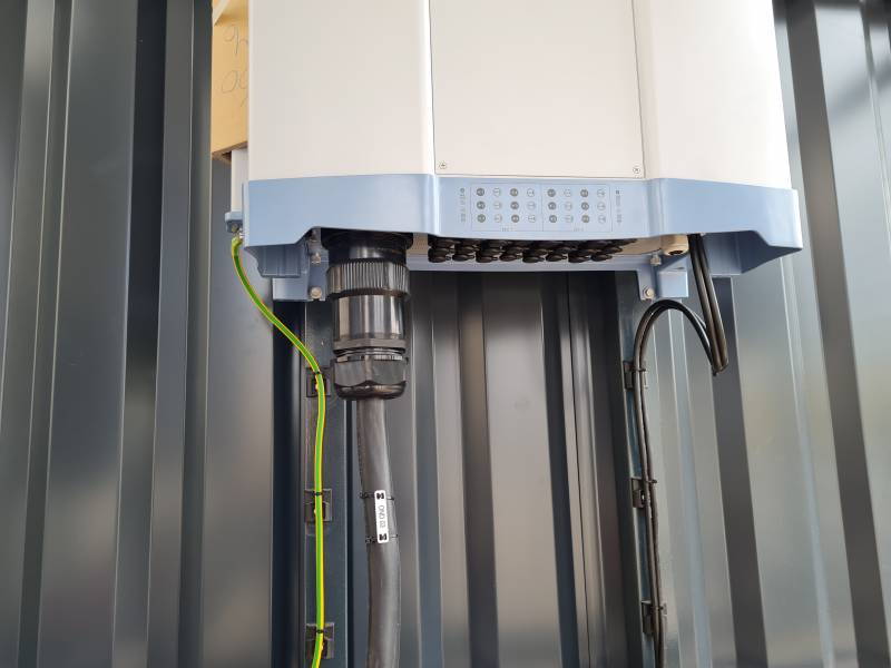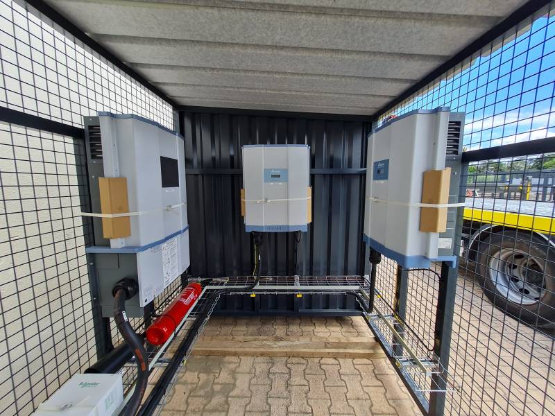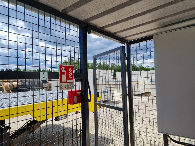 Ecolocal (Shelter photovoltaïque) 250 kVA réalisé par Elexpert à la demande du client, une zone de stockage bardée a été créé à côté de la zone onduleur - TGBT. Elle permet notamment d'y stocker des modules supplémentaire et du matériel à destination des équipes de maintenance tout en les cachant de la vue des passants.